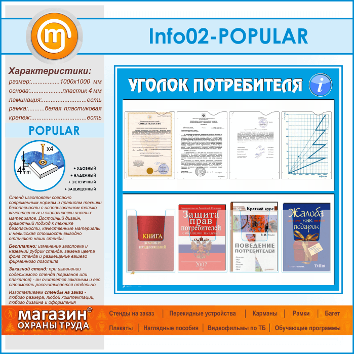 Стенд «Уголок потребителя» с 4 плоскими и 4 объемными карманами А4 формата (IN-02-POPULAR) в Новосибирске купить